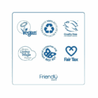 Friendly hársápustykkin eru án; Pálmaolíu, paraben, súlfats, tríklósan, phthalate (þalöt), já og grimmdar. Umbúðir þeirra eru úr endurunnum pappír, án plasts og þær má endurvinna aftur. Friendly sápurnar eru jafnframt skráðar og samþykktar hjá: The Vegan Society, Cruelty Free International og Green Salon samtökunum og fá hæstu einkunn hjá The Ethical Consumer.